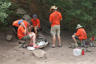 Woke up at 3:00 AM and got a few last minute things done. Went back to sleep and up again at 5:50 AM with the alarm. Breakfast of eggs and toast. Left to go to the airport at 7:45 AM stopping at Sheetz to pick up snacks for the plane. Everyone arrives at terminal 1 on time by 8:15 AM. Last insurance card copy collected. Tickets handed out to all but Keegan and Chris who got theirs “later”. Mostly smooth through security except Jordan got his bottle of sunscreen confiscated. Had to wait a while for our 9:55 AM flight. Got seats together in the back of the plane. Good flight. Read about half of “The New Cool”. Had “plane” crackers, pretzels, peanuts and Sprite Zero along with the chocolate chip cookies I brought. Got to Denver about 30 minutes early. Talked to a Scouter from Baltimore at baggage claim. Found Dollar Rent-a-Car bus and got on the second one. Discovered at Dollar that our reservations were with Thrifty. Fortunately it was right next to Dollar. Wound up renting a 12-passenger van instead of the 3 full-size cars that were reserved. Drove out of the airport looking for a place to eat. Crew wanted Mexican, so I suggested Casa Bonita. Got directions there by cell phone. Turned out to be the wrong place. Ate at Ludita’s instead. Had tamales and Inca Cola. Drove to the Air Force Academy (75 MPH speed limit). We walked around the campus and saw the chapel. When we returned to the van, Christian could not find his ID. I ran back to look for it. I received a cell phone call to come back as it had been found. On to the Garden of the Gods Campground. Set up camp around other Scouts including Crew 718-S from West Virginia. Drove to Flying W Ranch for a chuck wagon dinner and western show. The food was quite good: beef brisket, baked beans, apple sauce, biscuit, and spice cake. The western show was really good with the Flying W Wranglers – the second oldest western band at 59 years. They were all very talented. The opossum song was the highlight. Drove back to camp with one wrong turn. Great orange full moon seen on the ride back to camp. All went to bed pretty quickly at 10:00 PM.